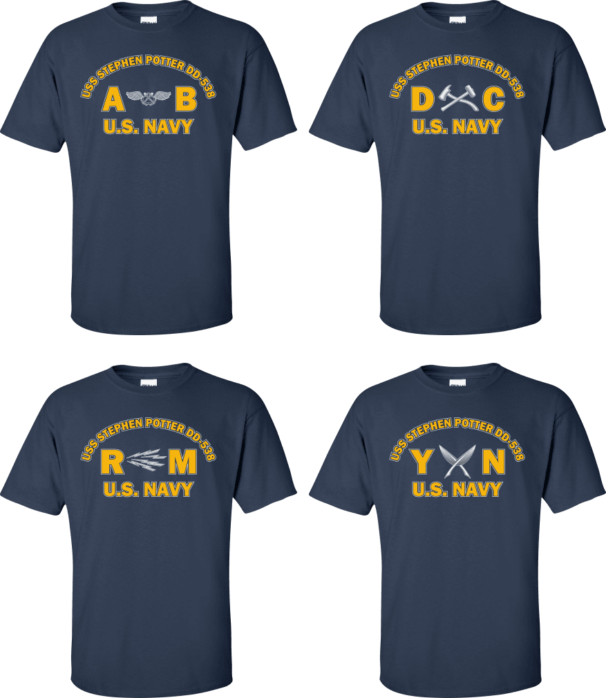 Due to disruptions in supply chains, this design will be embroidered on a Champion, Gildan, Jerzees or comparable brand.Proudly display your ship and rate with our top quality USS STEPHEN POTTER DD-538 Rates t-shirts, sweatshirts, and hoodies. These fine U.S. Navy apparel items will make you the envy of your veteran buddies, or will make a fine gift! Our USS STEPHEN POTTER DD-538 shirts are proudly printed in the USA!