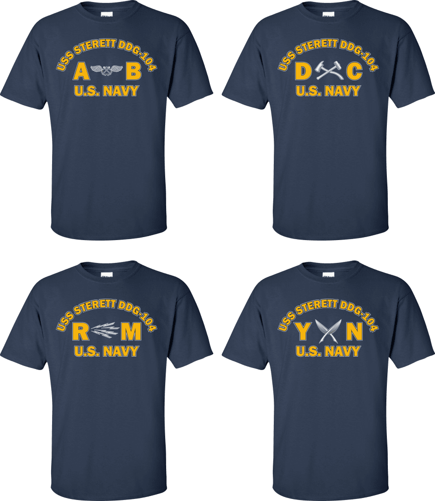 Due to disruptions in supply chains, this design will be embroidered on a Champion, Gildan, Jerzees or comparable brand.Proudly display your ship and rate with our top quality USS STERETT DDG-104 Rates t-shirts, sweatshirts, and hoodies. These fine U.S. Navy apparel items will make you the envy of your veteran buddies, or will make a fine gift! Our USS STERETT DDG-104 shirts are proudly printed in the USA!