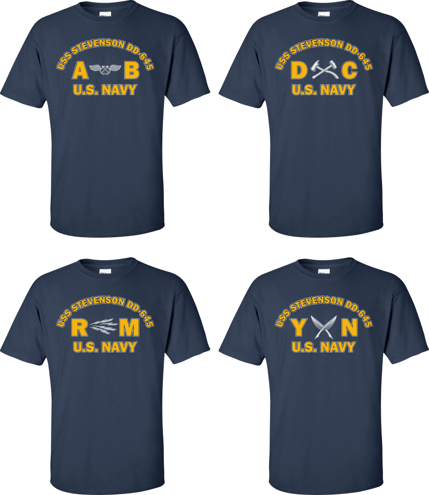 Due to disruptions in supply chains, this design will be embroidered on a Champion, Gildan, Jerzees or comparable brand.Proudly display your ship and rate with our top quality USS STEVENSON DD-645 Rates t-shirts, sweatshirts, and hoodies. These fine U.S. Navy apparel items will make you the envy of your veteran buddies, or will make a fine gift! Our USS STEVENSON DD-645 shirts are proudly printed in the USA!
