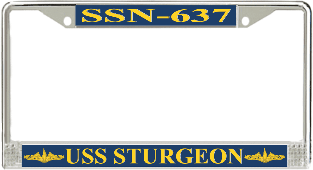 USS Sturgeon SSN-637 License Plate Frame This USS Sturgeon SSN-637 License Plate Frame is proudly made in the USA at our facilities in Scottsboro, Alabama. Each Frame features top and bottom sublimated design strips that are poly coated for a protective gloss finish. Please check your state and local regulations for compatibility of these frames for use on your vehicle.