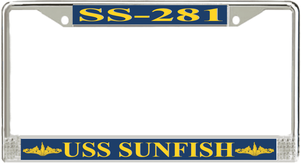 USS Sunfish SS-281 License Plate Frame This USS Sunfish SS-281 License Plate Frame is proudly made in the USA at our facilities in Scottsboro, Alabama. Each Frame features top and bottom sublimated design strips that are poly coated for a protective gloss finish. Please check your state and local regulations for compatibility of these frames for use on your vehicle.
