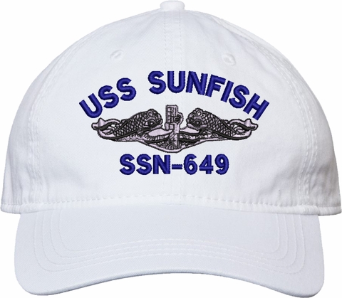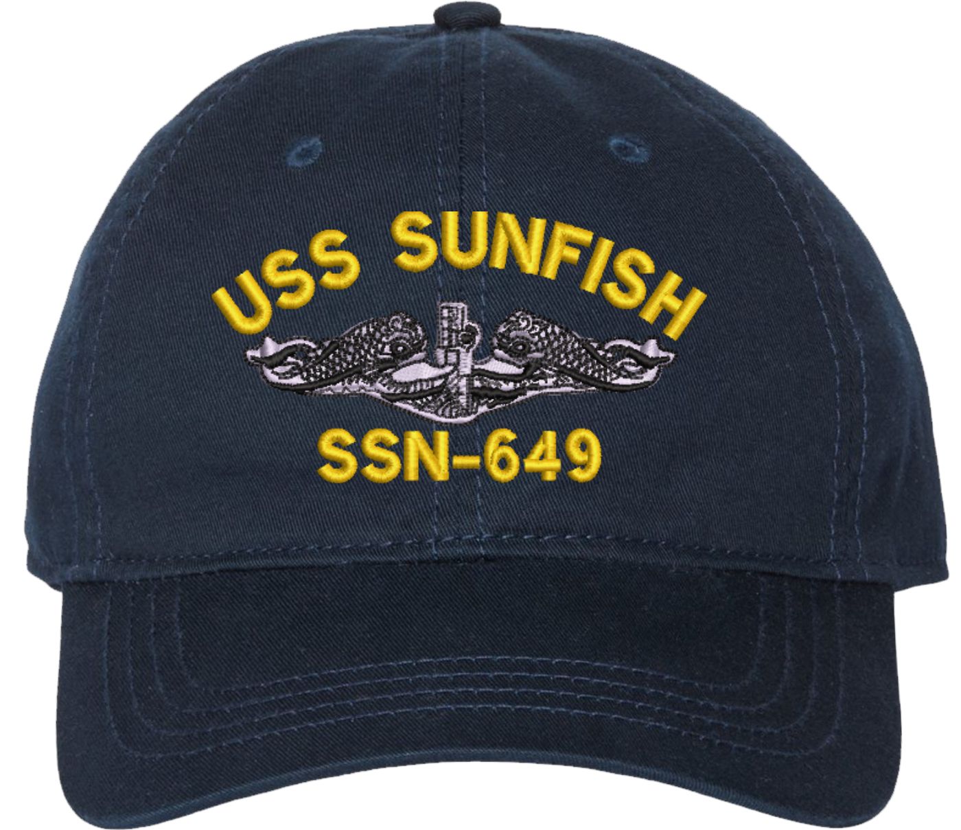 Show your Navy pride with this USS Sunfish SSN-649 with Dolphins Unstructured Dad Cap from MilitaryBest. Crafted from 100% washed chino twill cotton, this six-panel, low-profile cap offers a relaxed and comfortable fit. Featuring high-quality embroidery done in our Scottsboro, Alabama facility, this cap is designed with a pre-curved visor and an adjustable tri-glide buckle closure for a perfect fit. Whether for everyday wear or as a meaningful gift, this cap is a great way to honor your own or a loved one's service.For caps ordered with custom embroidered personalized text please allow an additional 3 to 5 days production time. All custom back text will be embroidered in ALL CAPITAL LETTERS. Caps with back text or eggs are non-returnable unless there is a material defect in the cap.