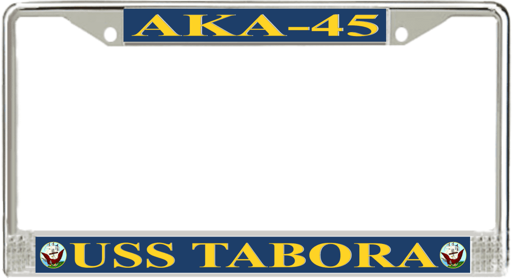 USS Tabora AKA-45 License Plate FrameThis USS Tabora AKA-45 License Plate Frame is proudly made in the USA at our facilities in Scottsboro, Alabama. Each of our MilitaryBest U.S. Navy Frames feature top and bottom Poly Coated Aluminum strips that are printed using sublimation which gives these quality automobile military frames a beautiful high gloss finish.