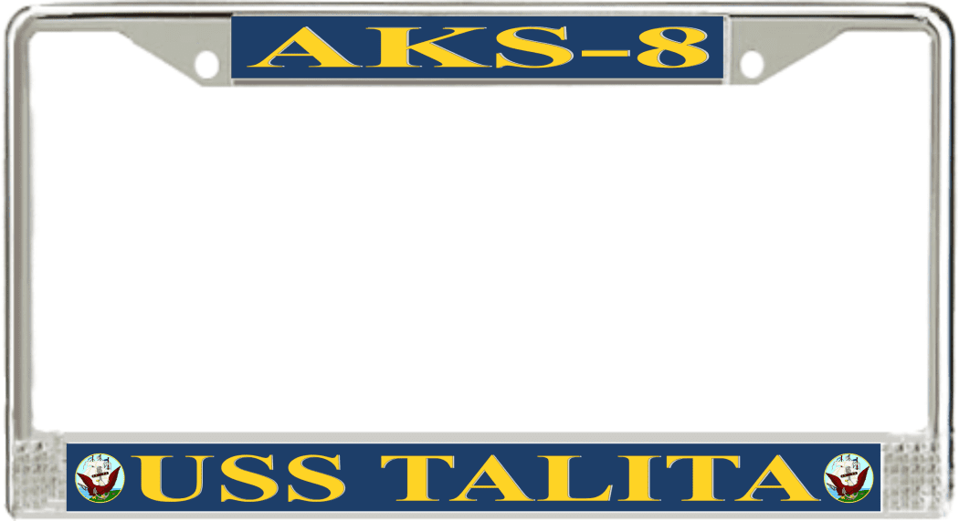USS Talita AKS-8 License Plate FrameThis USS Talita AKS-8 License Plate Frame is proudly made in the USA at our facilities in Scottsboro, Alabama. Each of our MilitaryBest U.S. Navy Frames feature top and bottom Poly Coated Aluminum strips that are printed using sublimation which gives these quality automobile military frames a beautiful high gloss finish.