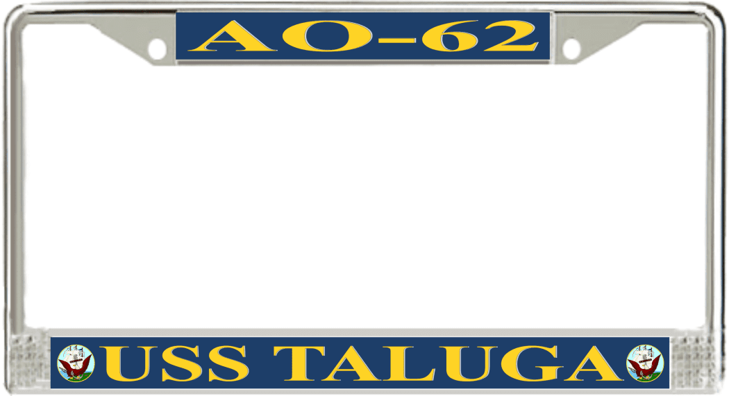 USS Taluga AO-62 License Plate FrameThis USS Taluga AO-62 License Plate Frame is proudly made in the USA at our facilities in Scottsboro, Alabama. Each of our MilitaryBest U.S. Navy Frames feature top and bottom Poly Coated Aluminum strips that are printed using sublimation which gives these quality automobile military frames a beautiful high gloss finish.