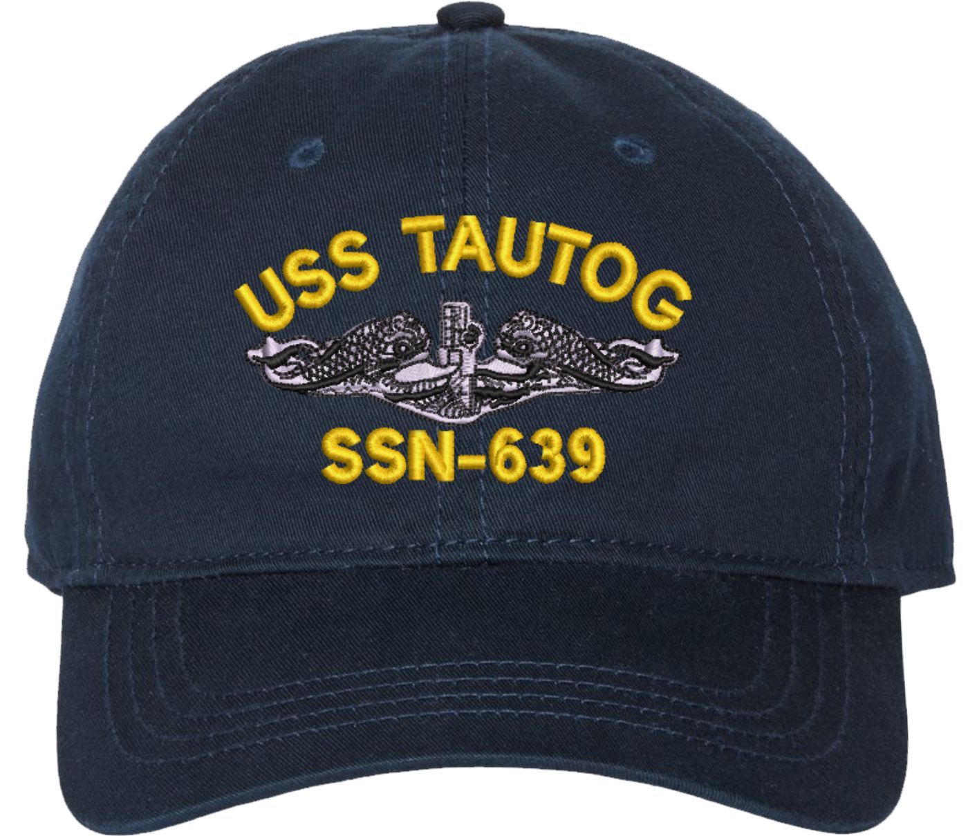 This USS Tautog SSN-639 w/ Silver Dolphins Navy Blue Unstructured Dad Cap is an overstock item and is only available for the value price while supplies last. Clearance Items are not eligible for Refunds or Returns,A percentage of the sale of each MilitaryBest item is forwarded to the licensing departments of each respective branch of service in support of the MWR (Morale, Welfare, & Recreation) program. These payments are made by either ALL4U LLC or the wholesaler from where the item originated. Our team thanks you for your service and your support of these programs.