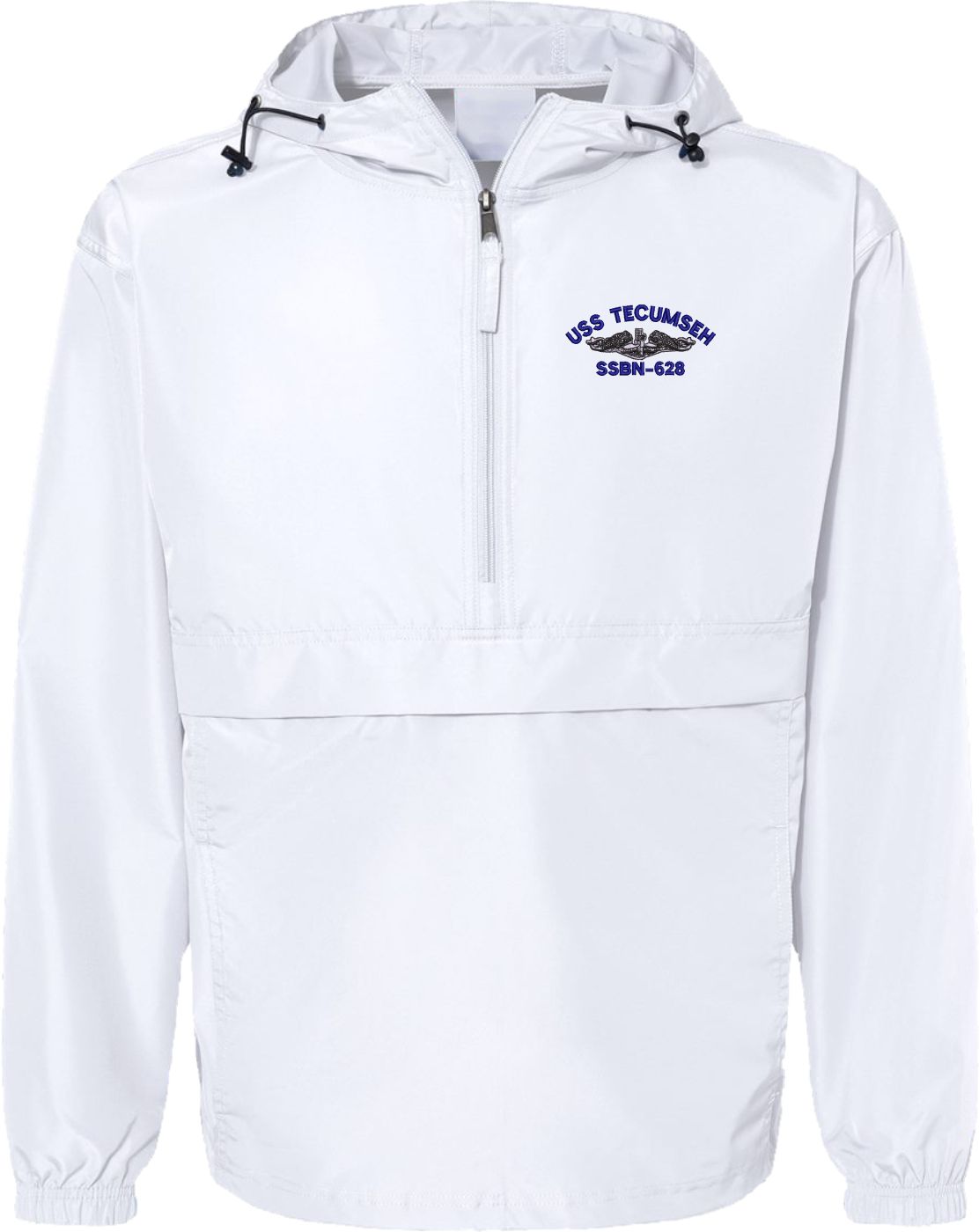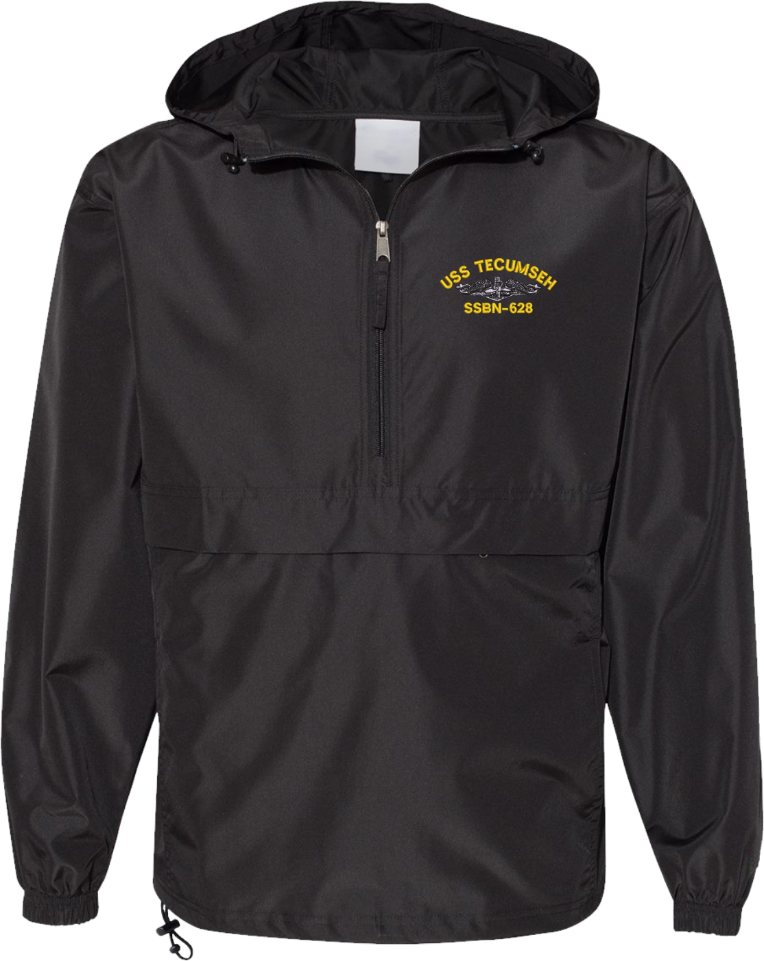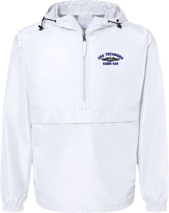 MilitaryBest is proud to offer this quality USS Tecumseh SSBN-628 with Dolphins Hooded Windbreaker. Also known as an Anorak Jacket, this windbreaker is designed to keep wind and water out. With a design embroidered over the left chest, this windbreaker is embroidered to order at our facilities in Scottsboro, AL.. This windbreaker can be packed into the mesh lined pouch pocket for a more portable method of storage.- 100% Polyester