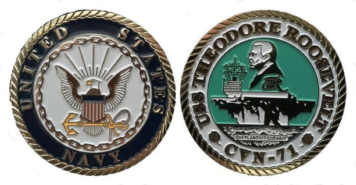 This USS Theodore Roosevelt CVN-71 Challenge Coin Enlisted measures 1-3/4 inches and is made from a bronze alloy with a brilliantly colored nickel finish. This Challenge Coin would make a wonderful addition to your collection or a great gift. Its quality is guaranteed.Does NOT Fit in Acrylic Single 1 5/8" Challenge Coin Display Case