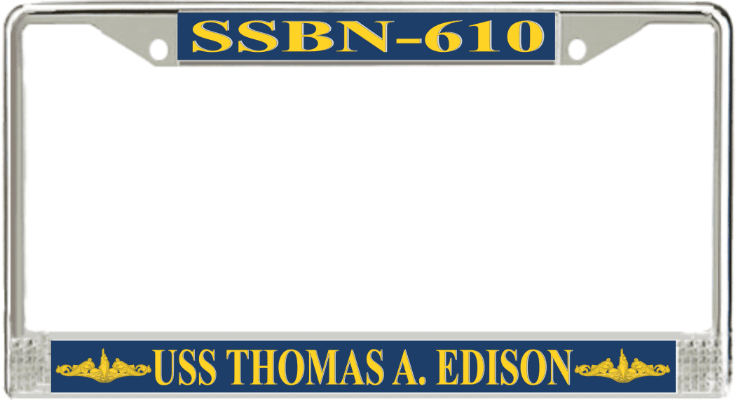 USS Thomas A. Edison SSBN-610 License Plate Frame This USS Thomas A. Edison SSBN-610 License Plate Frame is proudly made in the USA at our facilities in Scottsboro, Alabama. Each Frame features top and bottom sublimated design strips that are poly coated for a protective gloss finish. Please check your state and local regulations for compatibility of these frames for use on your vehicle.