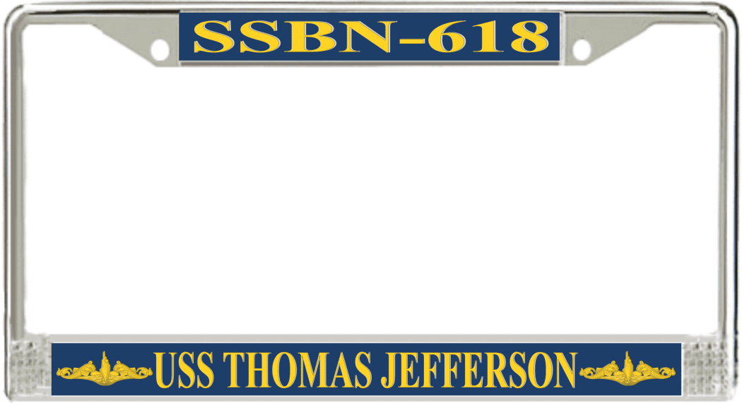 USS Thomas Jefferson SSBN-618 License Plate Frame This USS Thomas Jefferson SSBN-618 License Plate Frame is proudly made in the USA at our facilities in Scottsboro, Alabama. Each Frame features top and bottom sublimated design strips that are poly coated for a protective gloss finish. Please check your state and local regulations for compatibility of these frames for use on your vehicle.