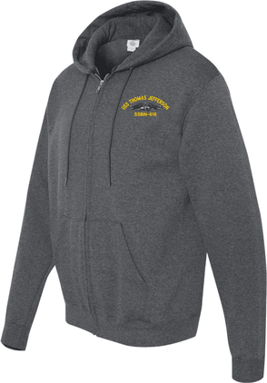 MilitaryBest has expanded its line of apparel with this custom embroidered USS Thomas Jefferson SSBN-618 with Dolphins Embroidered Zippered Hoodie. Each Hoodie is direct embroidered onto a Champion brand 9.5 oz 50/50 Cotton Poly blend. This will make an excellent addition to your wardrobe, or a great gift. Your satisfaction is Guaranteed! These quality zippered hoodies are proudly embroidered at our facilities in Scottsboro, AL. Support the Army MWR program by purchasing only from Licensed Vendors.