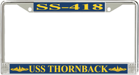 USS Thornback SS-418 License Plate Frame This USS Thornback SS-418 License Plate Frame is proudly made in the USA at our facilities in Scottsboro, Alabama. Each Frame features top and bottom sublimated design strips that are poly coated for a protective gloss finish. Please check your state and local regulations for compatibility of these frames for use on your vehicle.