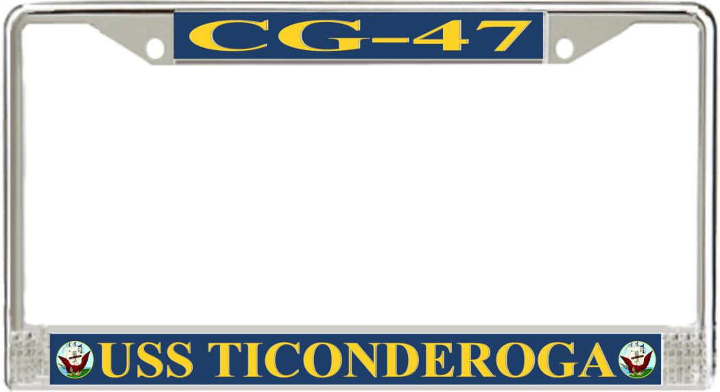 USS Ticonderoga CG-47 License Plate FrameThis USS Ticonderoga CG-47 License Plate Frame is proudly made in the USA at our facilities in Scottsboro, Alabama. Each of our MilitaryBest U.S. Navy Frames feature top and bottom Poly Coated Aluminum strips that are printed using sublimation which gives these quality automobile military frames a beautiful high gloss finish.
