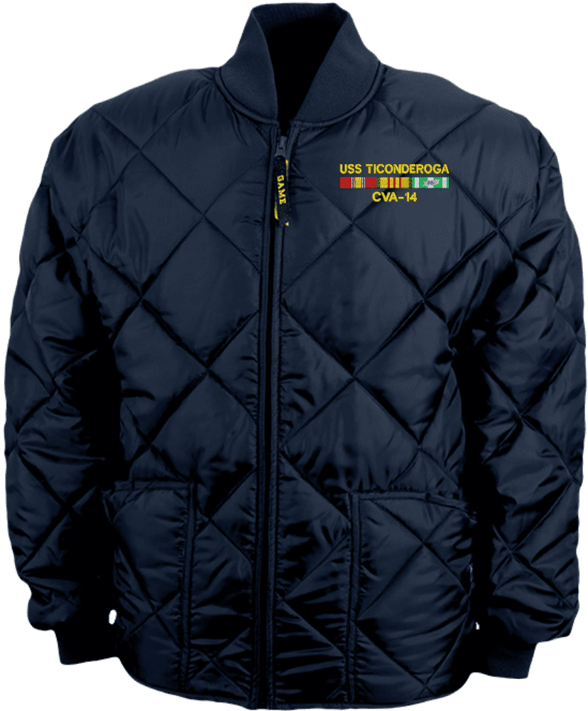 MilitaryBest is proud to offer this quality USS Ticonderoga CVA-14 with Vietnam Service Ribbons Bravest Jacket. This Game Sportswear Jacket will make an excellent addition to your wardrobe or a quality gift. This Jacket is custom embroidered at our facilities in Scottsboro, Alabama.Features: