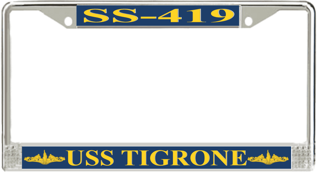 USS Tigrone SS-419 License Plate Frame This USS Tigrone SS-419 License Plate Frame is proudly made in the USA at our facilities in Scottsboro, Alabama. Each Frame features top and bottom sublimated design strips that are poly coated for a protective gloss finish. Please check your state and local regulations for compatibility of these frames for use on your vehicle.