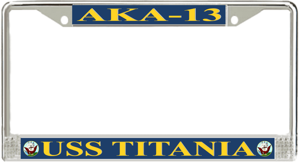 USS Titania AKA-13 License Plate FrameThis USS Titania AKA-13 License Plate Frame is proudly made in the USA at our facilities in Scottsboro, Alabama. Each of our MilitaryBest U.S. Navy Frames feature top and bottom Poly Coated Aluminum strips that are printed using sublimation which gives these quality automobile military frames a beautiful high gloss finish.