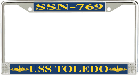 USS Toledo SSN-769 License Plate Frame This USS Toledo SSN-769 License Plate Frame is proudly made in the USA at our facilities in Scottsboro, Alabama. Each Frame features top and bottom sublimated design strips that are poly coated for a protective gloss finish. Please check your state and local regulations for compatibility of these frames for use on your vehicle.