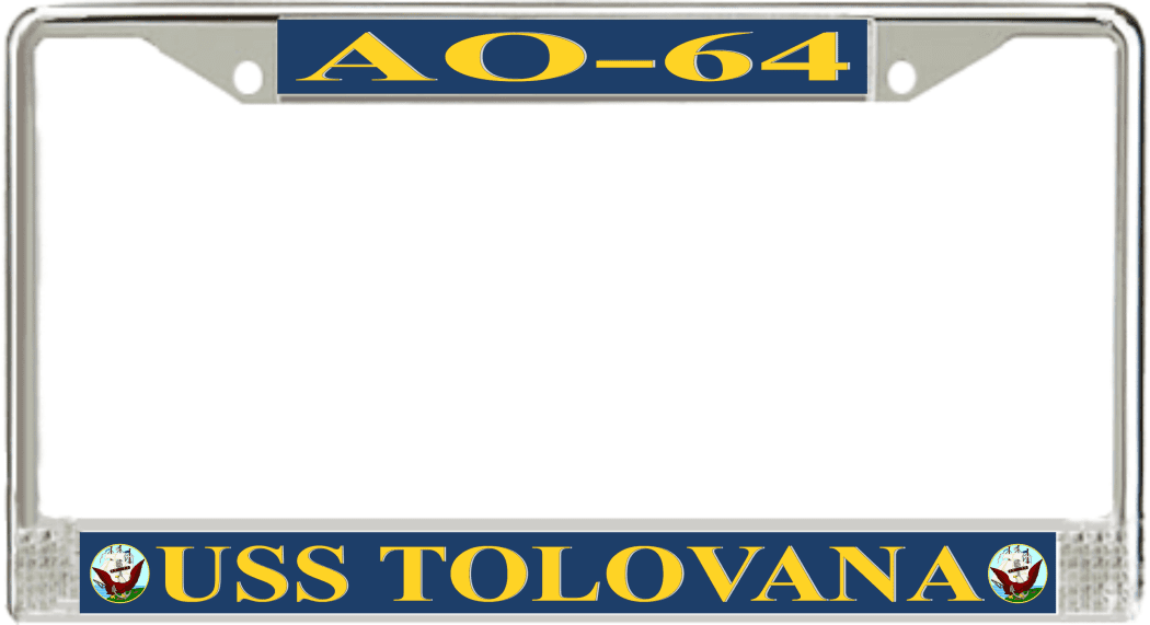 USS Tolovana AO-64 License Plate FrameThis USS Tolovana AO-64 License Plate Frame is proudly made in the USA at our facilities in Scottsboro, Alabama. Each of our MilitaryBest U.S. Navy Frames feature top and bottom Poly Coated Aluminum strips that are printed using sublimation which gives these quality automobile military frames a beautiful high gloss finish.