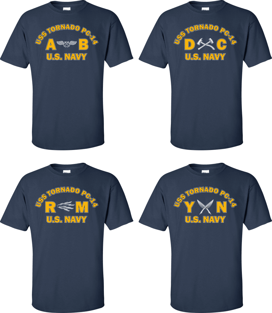 Due to disruptions in supply chains, this design will be embroidered on a Champion, Gildan, Jerzees or comparable brand.Proudly display your ship and rate with our top quality USS TORNADO PC-14 Rates t-shirts, sweatshirts, and hoodies. These fine U.S. Navy apparel items will make you the envy of your veteran buddies, or will make a fine gift! Our USS TORNADO PC-14 shirts are proudly printed in the USA!