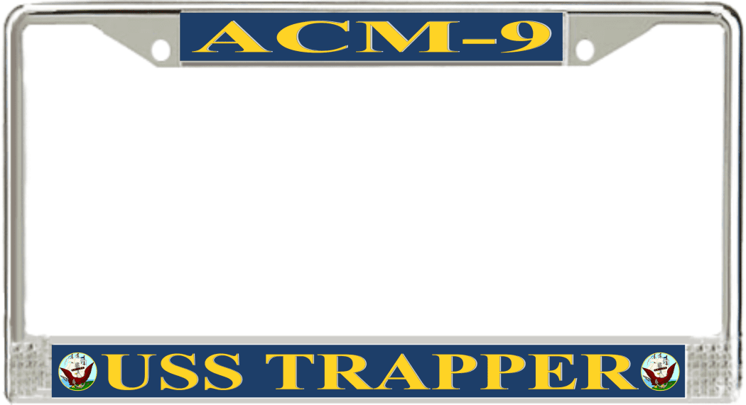 USS Trapper ACM-9 License Plate FrameThis USS Trapper ACM-9 License Plate Frame is proudly made in the USA at our facilities in Scottsboro, Alabama. Each of our MilitaryBest U.S. Navy Frames feature top and bottom Poly Coated Aluminum strips that are printed using sublimation which gives these quality automobile military frames a beautiful high gloss finish.
