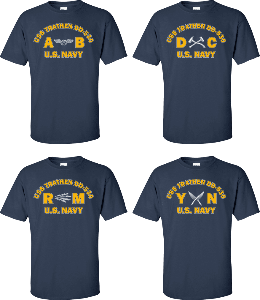 Due to disruptions in supply chains, this design will be embroidered on a Champion, Gildan, Jerzees or comparable brand.Proudly display your ship and rate with our top quality USS TRATHEN DD-530 Rates t-shirts, sweatshirts, and hoodies. These fine U.S. Navy apparel items will make you the envy of your veteran buddies, or will make a fine gift! Our USS TRATHEN DD-530 shirts are proudly printed in the USA!