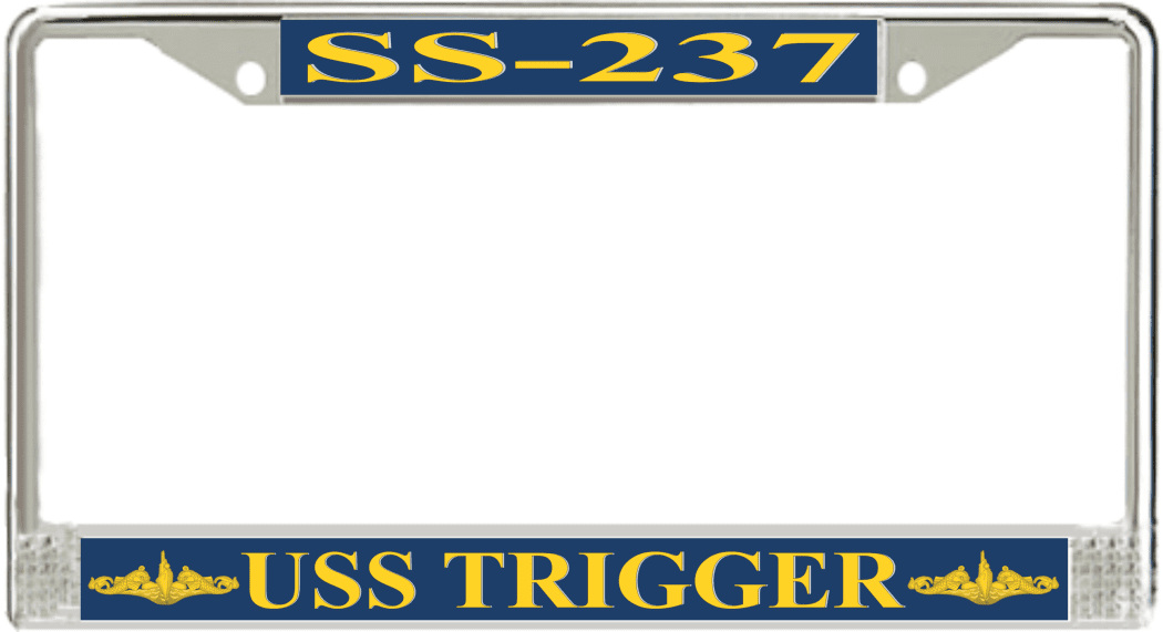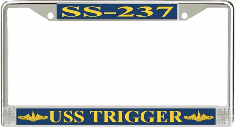 USS Trigger SS-237 License Plate Frame This USS Trigger SS-237 License Plate Frame is proudly made in the USA at our facilities in Scottsboro, Alabama. Each Frame features top and bottom sublimated design strips that are poly coated for a protective gloss finish. Please check your state and local regulations for compatibility of these frames for use on your vehicle.
