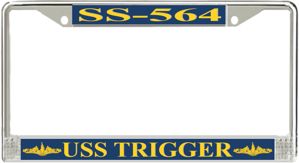 USS Trigger SS-564 License Plate Frame This USS Trigger SS-564 License Plate Frame is proudly made in the USA at our facilities in Scottsboro, Alabama. Each Frame features top and bottom sublimated design strips that are poly coated for a protective gloss finish. Please check your state and local regulations for compatibility of these frames for use on your vehicle.
