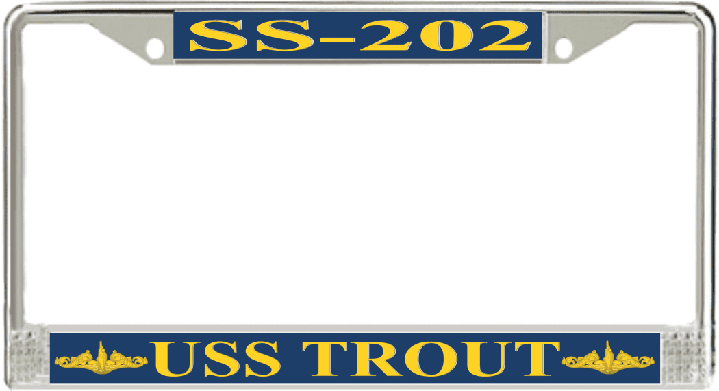USS Trout SS-202 License Plate Frame This USS Trout SS-202 License Plate Frame is proudly made in the USA at our facilities in Scottsboro, Alabama. Each Frame features top and bottom sublimated design strips that are poly coated for a protective gloss finish. Please check your state and local regulations for compatibility of these frames for use on your vehicle.