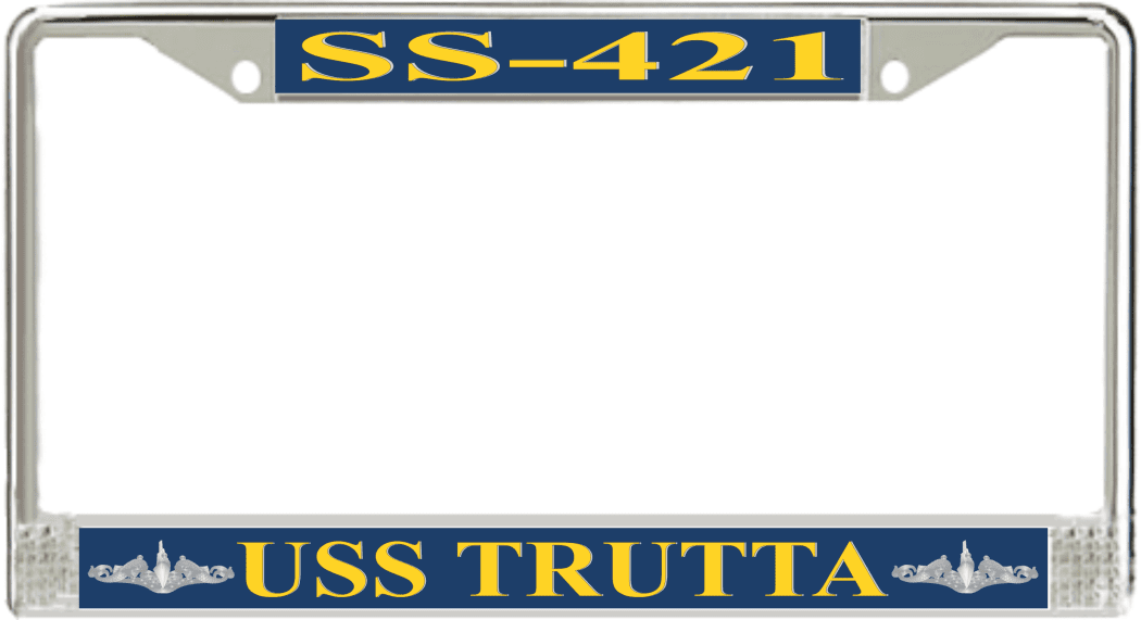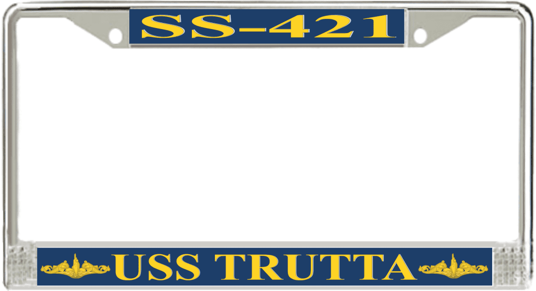 USS Trutta SS-421 License Plate Frame This USS Trutta SS-421 License Plate Frame is proudly made in the USA at our facilities in Scottsboro, Alabama. Each Frame features top and bottom sublimated design strips that are poly coated for a protective gloss finish. Please check your state and local regulations for compatibility of these frames for use on your vehicle.