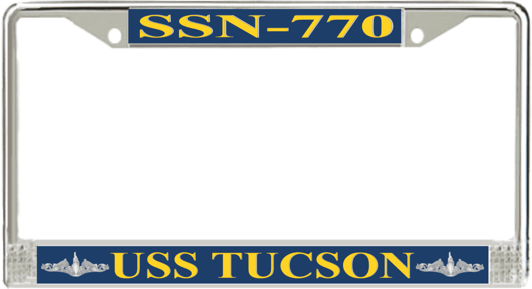 USS Tucson SSN-770 License Plate Frame This USS Tucson SSN-770 License Plate Frame is proudly made in the USA at our facilities in Scottsboro, Alabama. Each Frame features top and bottom sublimated design strips that are poly coated for a protective gloss finish. Please check your state and local regulations for compatibility of these frames for use on your vehicle.