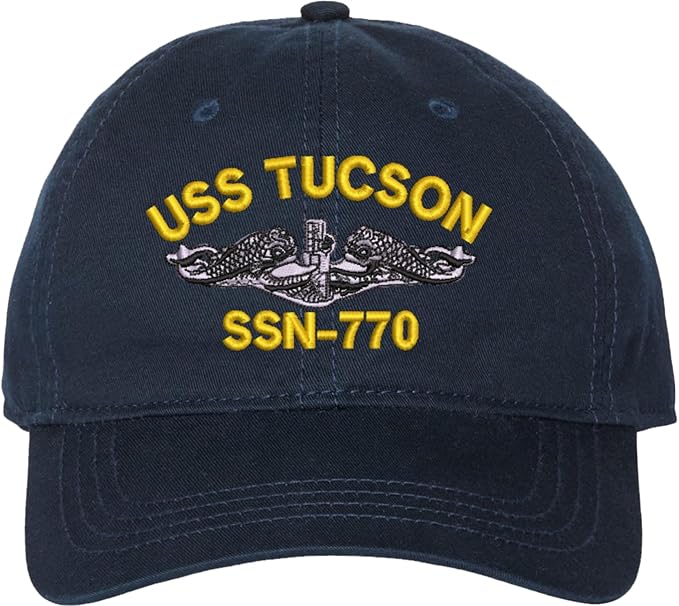This USS Tucson SSN-770 w/ Silver Dolphins Navy Blue Dad Cap is an overstock item and is only available for the value price while supplies last. Clearance Items are not eligible for Refunds or Returns,A percentage of the sale of each MilitaryBest item is forwarded to the licensing departments of each respective branch of service in support of the MWR (Morale, Welfare, & Recreation) program. These payments are made by either ALL4U LLC or the wholesaler from where the item originated. Our team thanks you for your service and your support of these programs.