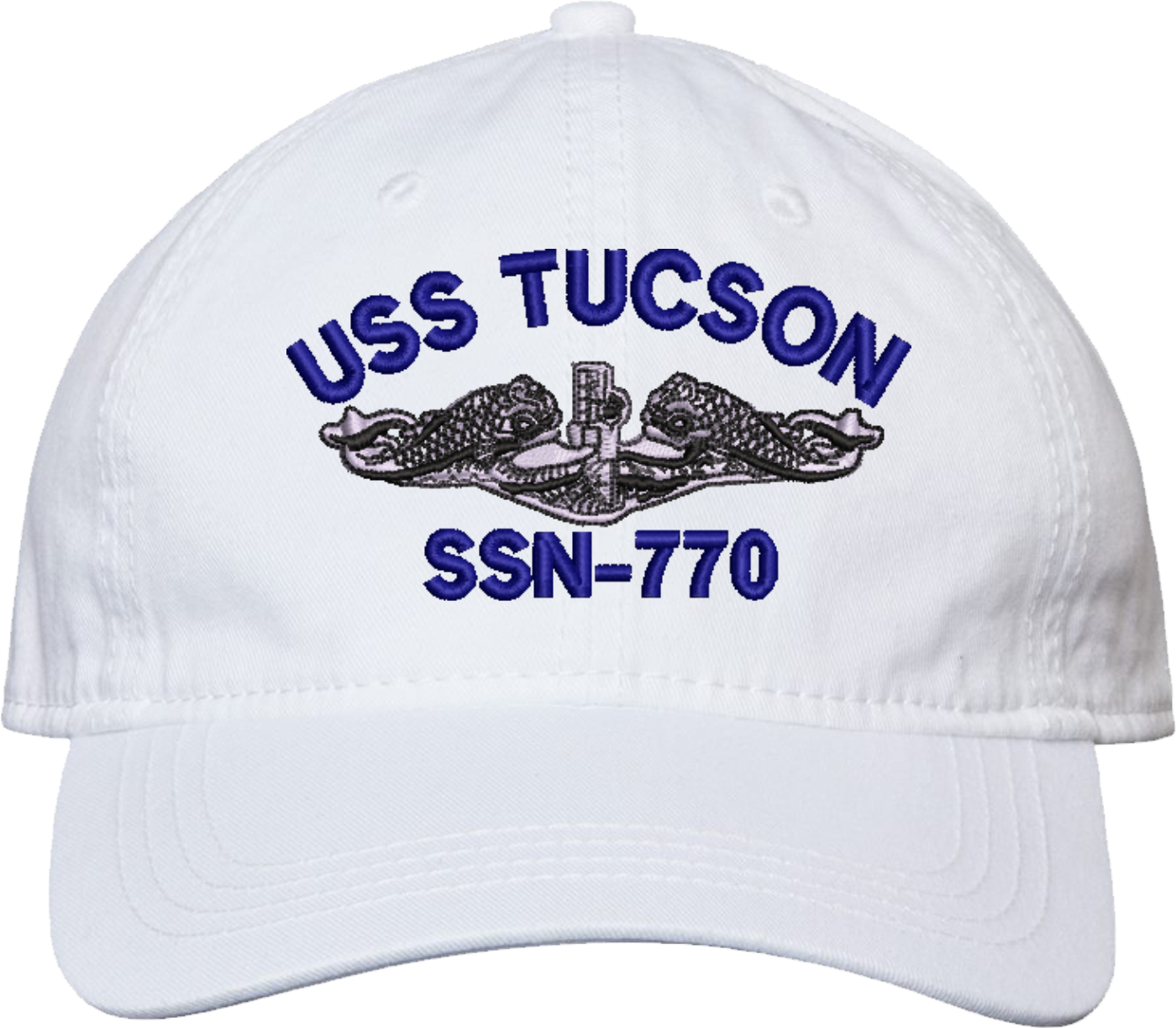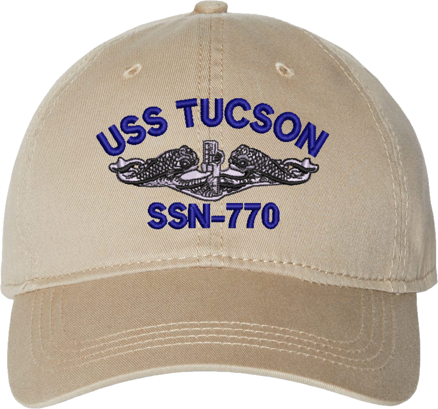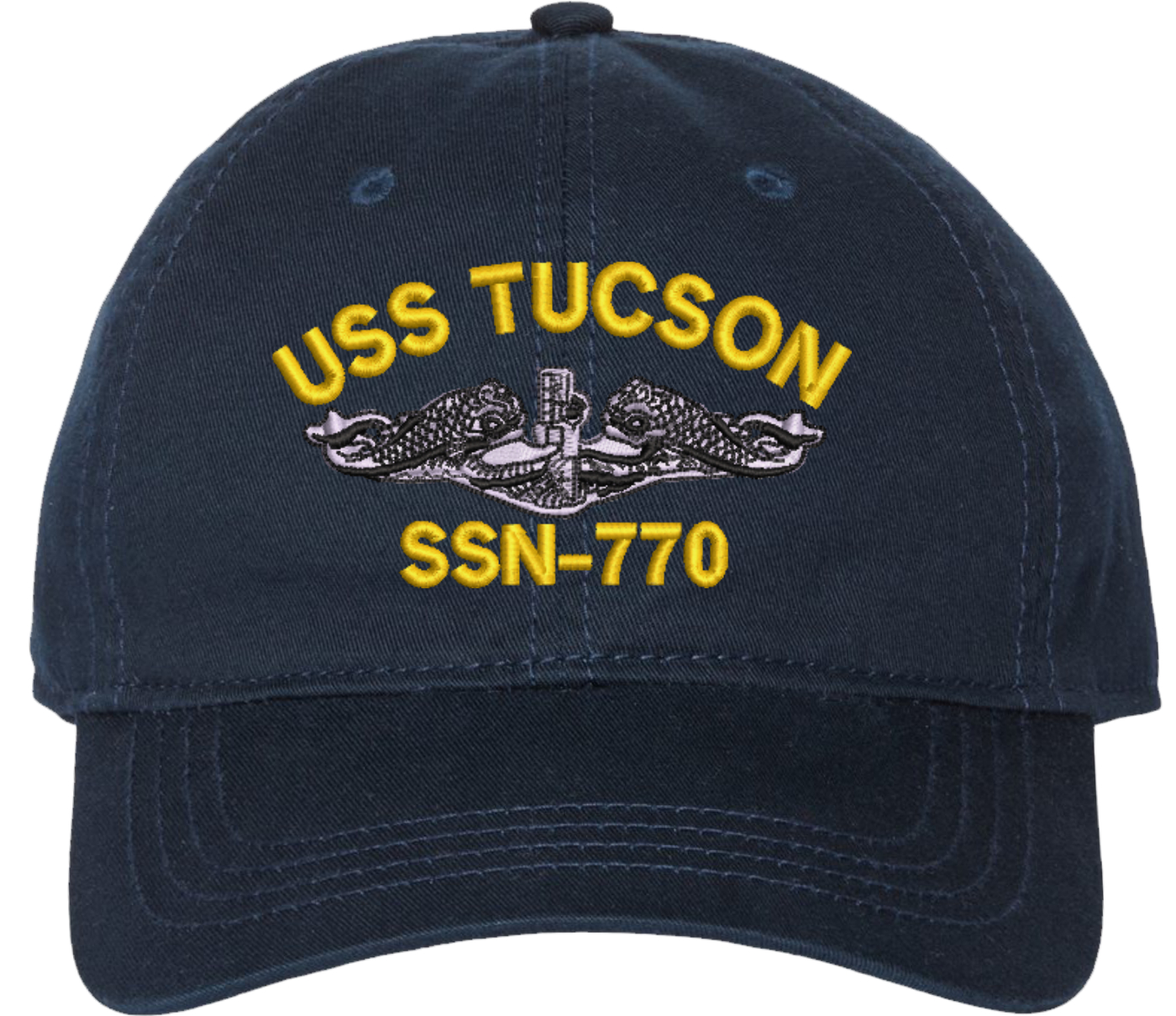 Show your Navy pride with this USS Tucson SSN-770 with Dolphins Unstructured Dad Cap from MilitaryBest. Crafted from 100% washed chino twill cotton, this six-panel, low-profile cap offers a relaxed and comfortable fit. Featuring high-quality embroidery done in our Scottsboro, Alabama facility, this cap is designed with a pre-curved visor and an adjustable tri-glide buckle closure for a perfect fit. Whether for everyday wear or as a meaningful gift, this cap is a great way to honor your own or a loved one's service.For caps ordered with custom embroidered personalized text please allow an additional 3 to 5 days production time. All custom back text will be embroidered in ALL CAPITAL LETTERS. Caps with back text or eggs are non-returnable unless there is a material defect in the cap.
