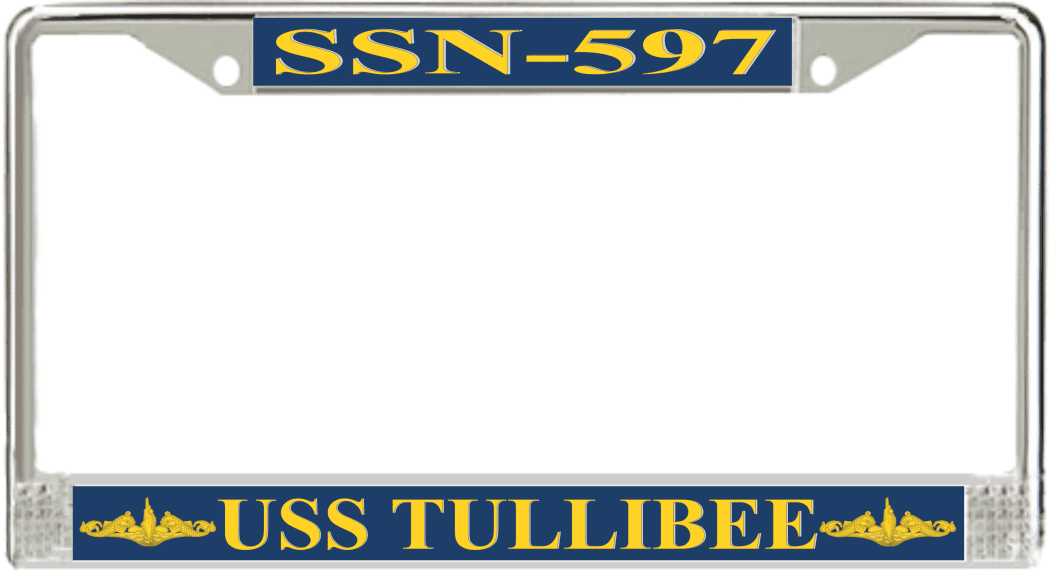 USS Tullibee SSN-597 License Plate Frame This USS Tullibee SSN-597 License Plate Frame is proudly made in the USA at our facilities in Scottsboro, Alabama. Each Frame features top and bottom sublimated design strips that are poly coated for a protective gloss finish. Please check your state and local regulations for compatibility of these frames for use on your vehicle.