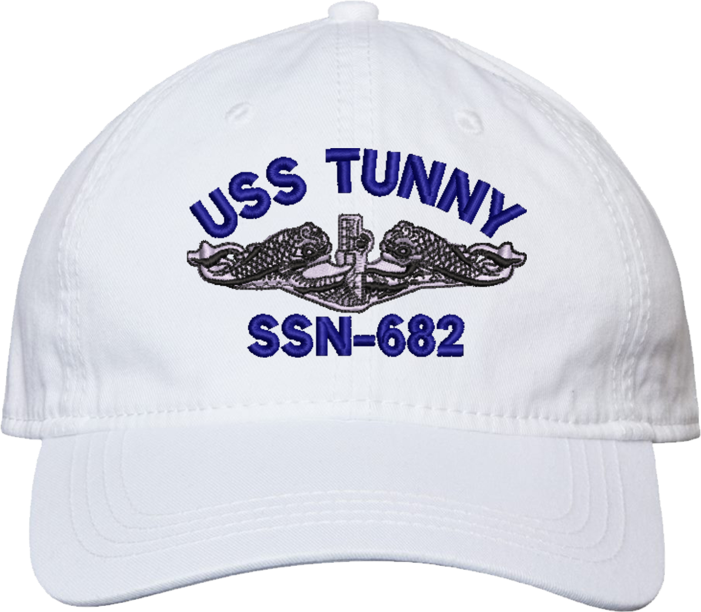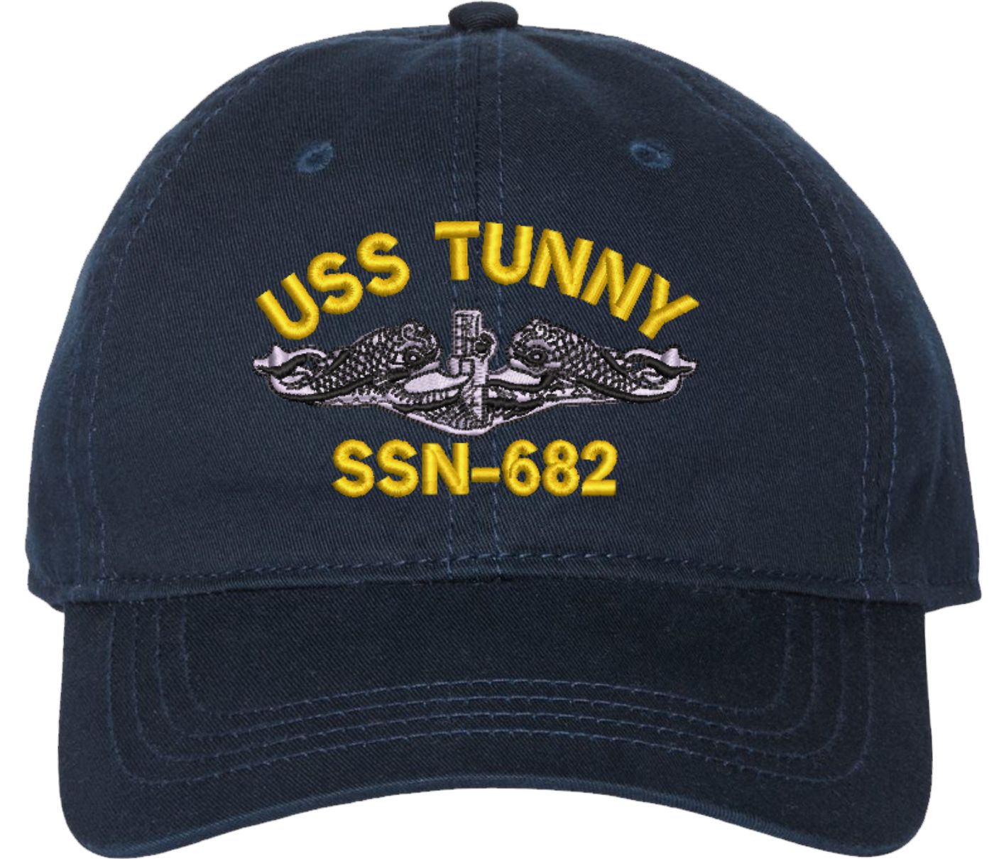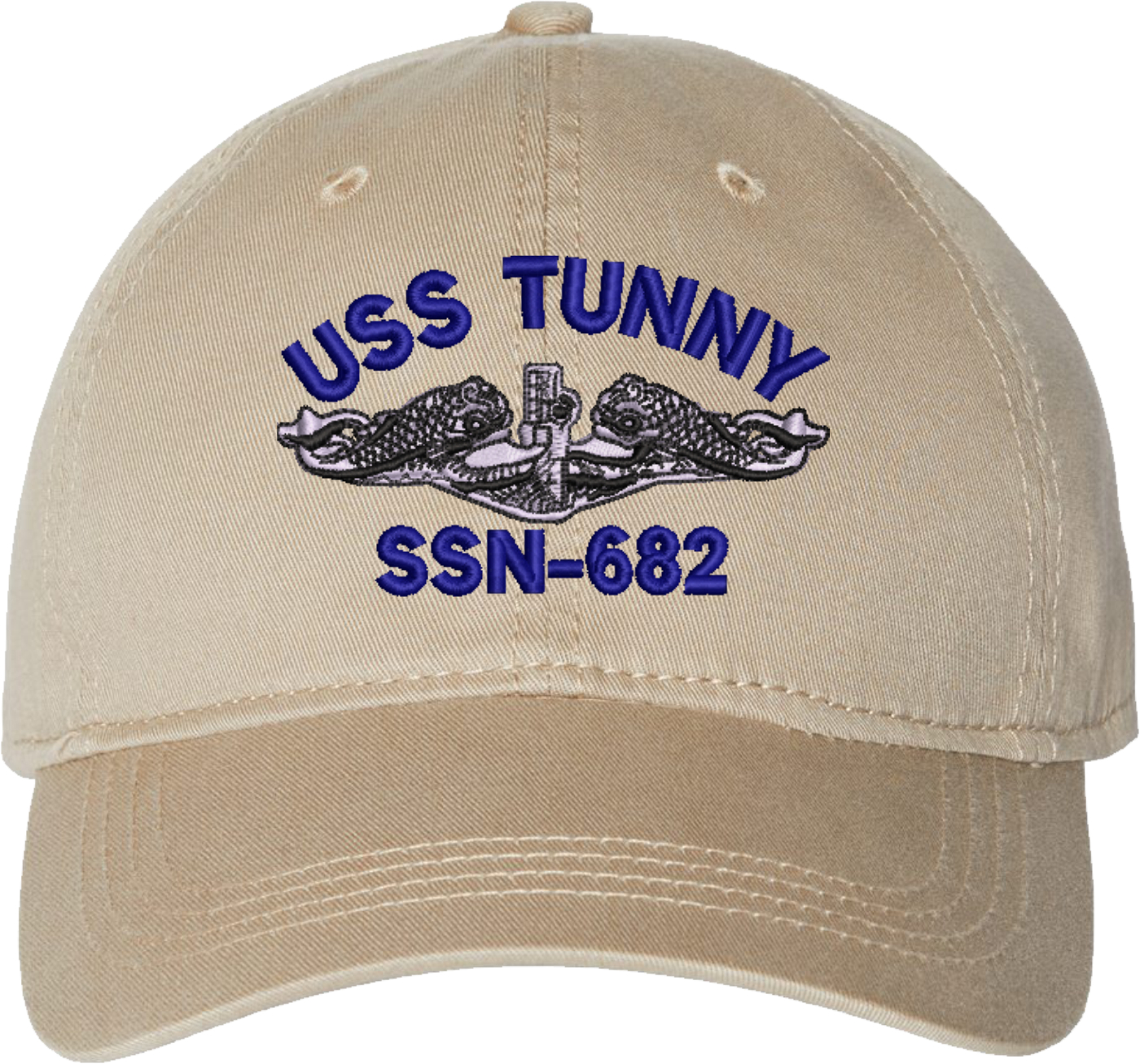 Show your Navy pride with this USS Tunny SSN-682 with Dolphins Unstructured Dad Cap from MilitaryBest. Crafted from 100% washed chino twill cotton, this six-panel, low-profile cap offers a relaxed and comfortable fit. Featuring high-quality embroidery done in our Scottsboro, Alabama facility, this cap is designed with a pre-curved visor and an adjustable tri-glide buckle closure for a perfect fit. Whether for everyday wear or as a meaningful gift, this cap is a great way to honor your own or a loved one's service.For caps ordered with custom embroidered personalized text please allow an additional 3 to 5 days production time. All custom back text will be embroidered in ALL CAPITAL LETTERS. Caps with back text or eggs are non-returnable unless there is a material defect in the cap.