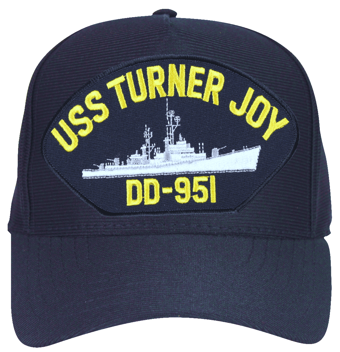 This USS Turner Joy DD-951 Ball Cap is an emblematic, poly, dark under the visor cap. Each has an adjustable strap, and is available as a 5 panel high profile or 6 panel low profile cap. All MilitaryBest caps are fully guaranteed. Some people call them Military Covers or Military Hats. This Military Cap is proudly Made in The U.S.A.For caps ordered with custom embroidered personalized text please allow an additional 3 to 5 days production time. All custom back text will be embroidered in ALL CAPITAL LETTERS. Caps with back text or eggs are non-returnable unless there is a material defect in the cap. If a style is not selected the cap will be made using a high profile style cap as pictured.