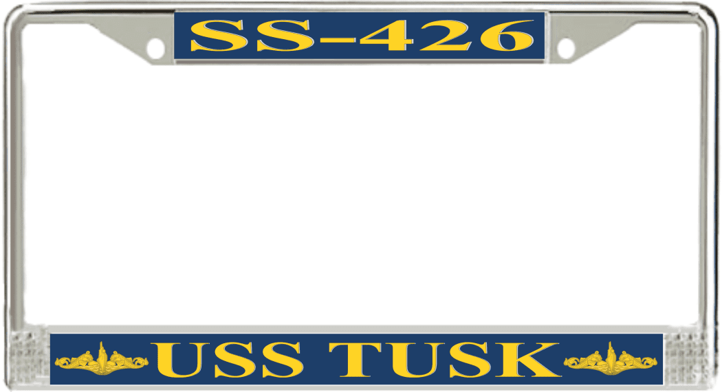 USS Tusk SS-426 License Plate Frame This USS Tusk SS-426 License Plate Frame is proudly made in the USA at our facilities in Scottsboro, Alabama. Each Frame features top and bottom sublimated design strips that are poly coated for a protective gloss finish. Please check your state and local regulations for compatibility of these frames for use on your vehicle.