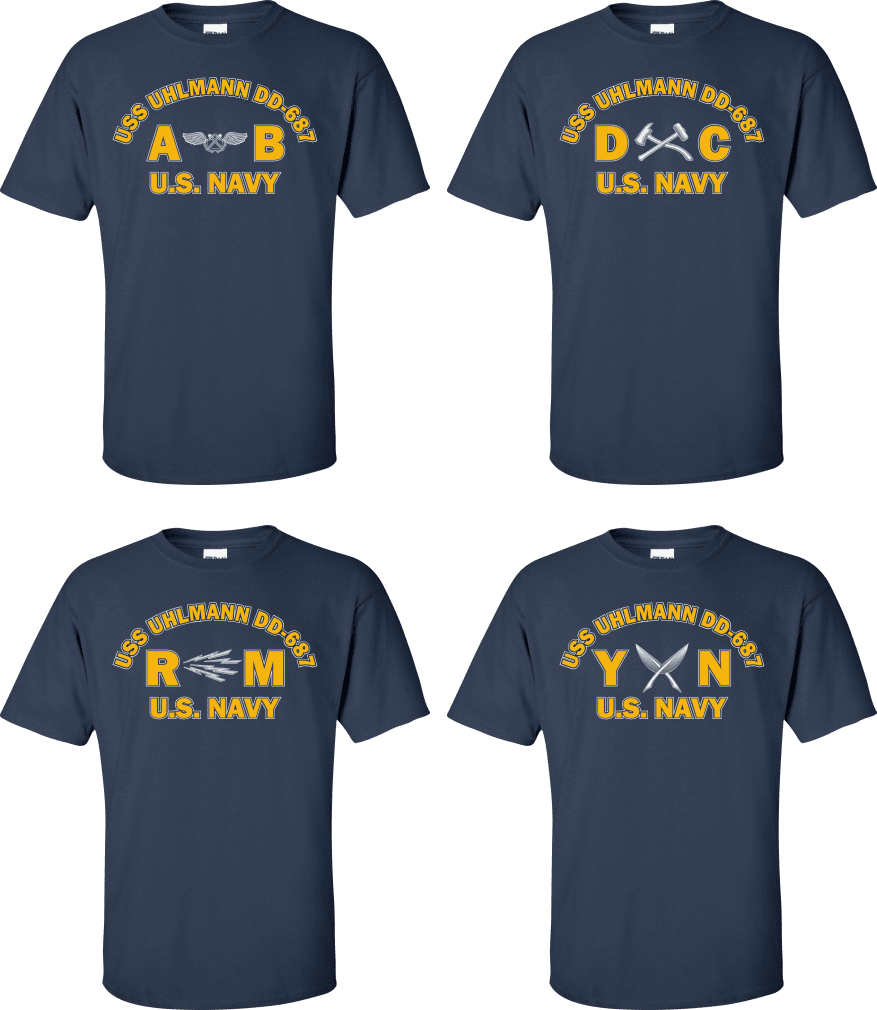 Due to disruptions in supply chains, this design will be embroidered on a Champion, Gildan, Jerzees or comparable brand.Proudly display your ship and rate with our top quality USS UHLMANN DD-687 Rates t-shirts, sweatshirts, and hoodies. These fine U.S. Navy apparel items will make you the envy of your veteran buddies, or will make a fine gift! Our USS UHLMANN DD-687 shirts are proudly printed in the USA!