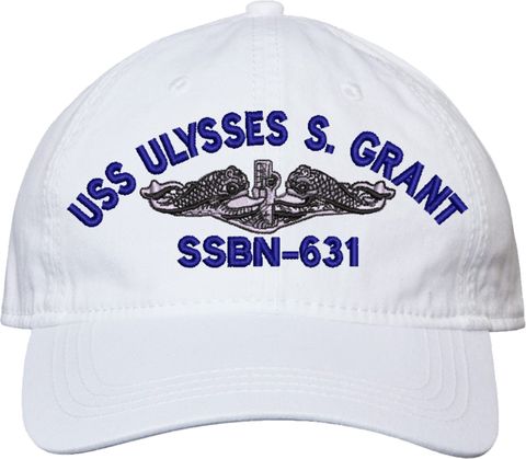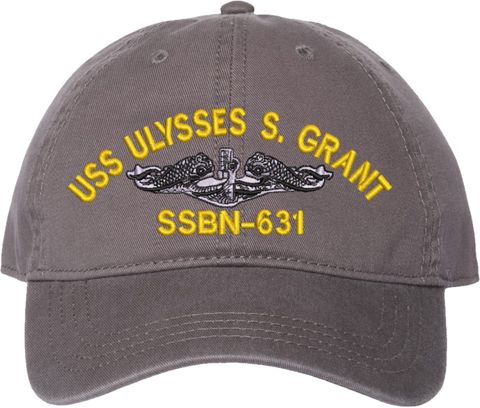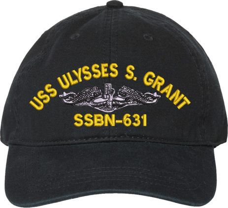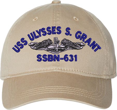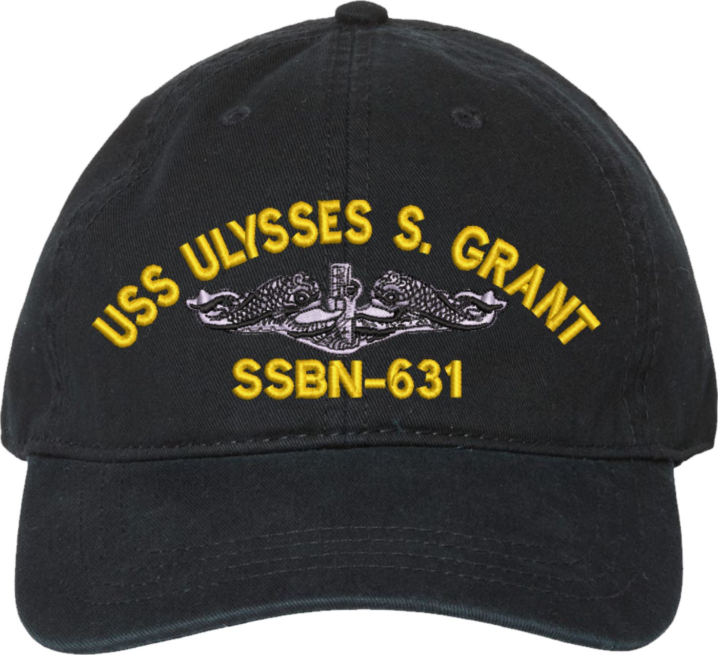 Show your Navy pride with this USS Ulysses S Grant SSBN-631 with Dolphins Unstructured Dad Cap from MilitaryBest. Crafted from 100% washed chino twill cotton, this six-panel, low-profile cap offers a relaxed and comfortable fit. Featuring high-quality embroidery done in our Scottsboro, Alabama facility, this cap is designed with a pre-curved visor and an adjustable tri-glide buckle closure for a perfect fit. Whether for everyday wear or as a meaningful gift, this cap is a great way to honor your own or a loved one's service.For caps ordered with custom embroidered personalized text please allow an additional 3 to 5 days production time. All custom back text will be embroidered in ALL CAPITAL LETTERS. Caps with back text or eggs are non-returnable unless there is a material defect in the cap.