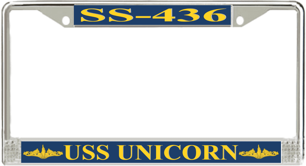 USS Unicorn SS-436 License Plate Frame This USS Unicorn SS-436 License Plate Frame is proudly made in the USA at our facilities in Scottsboro, Alabama. Each Frame features top and bottom sublimated design strips that are poly coated for a protective gloss finish. Please check your state and local regulations for compatibility of these frames for use on your vehicle.