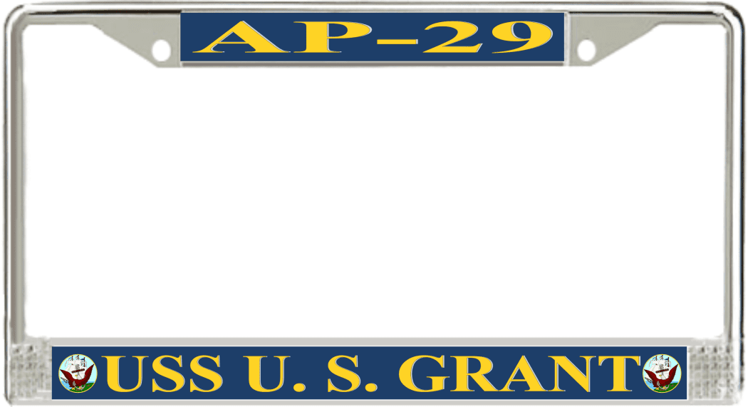 USS U. S. Grant AP-29 License Plate FrameThis USS U. S. Grant AP-29 License Plate Frame is proudly made in the USA at our facilities in Scottsboro, Alabama. Each of our MilitaryBest U.S. Navy Frames feature top and bottom Poly Coated Aluminum strips that are printed using sublimation which gives these quality automobile military frames a beautiful high gloss finish.