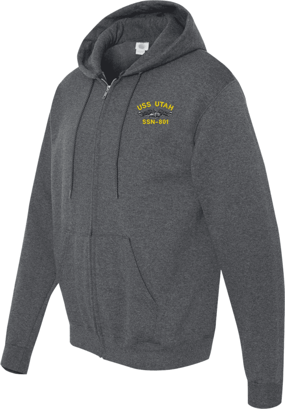MilitaryBest has expanded its line of apparel with this custom embroidered USS Utah SSN-801 with Dolphins Embroidered Zippered Hoodie. Each Hoodie is direct embroidered onto a Champion brand 9.5 oz 50/50 Cotton Poly blend. This will make an excellent addition to your wardrobe, or a great gift. Your satisfaction is Guaranteed! These quality zippered hoodies are proudly embroidered at our facilities in Scottsboro, AL. Support the Army MWR program by purchasing only from Licensed Vendors.