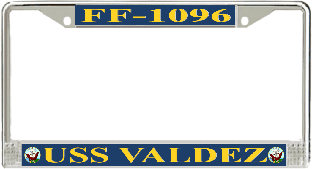 USS Valdez FF-1096 License Plate FrameThis USS Valdez FF-1096 License Plate Frame is proudly made in the USA at our facilities in Scottsboro, Alabama. Each of our MilitaryBest U.S. Navy Frames feature top and bottom Poly Coated Aluminum strips that are printed using sublimation which gives these quality automobile military frames a beautiful high gloss finish.