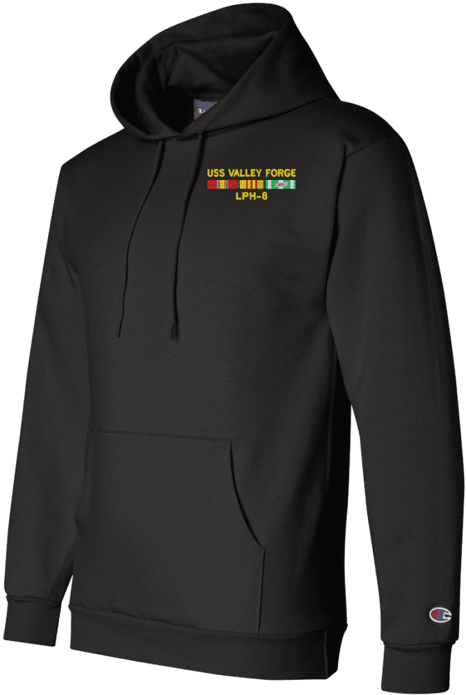 MilitaryBest has expanded its line of apparel with this custom embroidered USS Valley Forge LPH-8 with Vietnam Service Ribbons Hoodie. Each Hoodie is direct embroidered onto a Champion brand 9.5 oz 50/50 Cotton Poly blend. This Hoodie will make an excellent addition to your wardrobe, or a great gift. Your satisfaction is Guaranteed! This Hoodie is custom embroidered at our facilities in Scottsboro, AL.