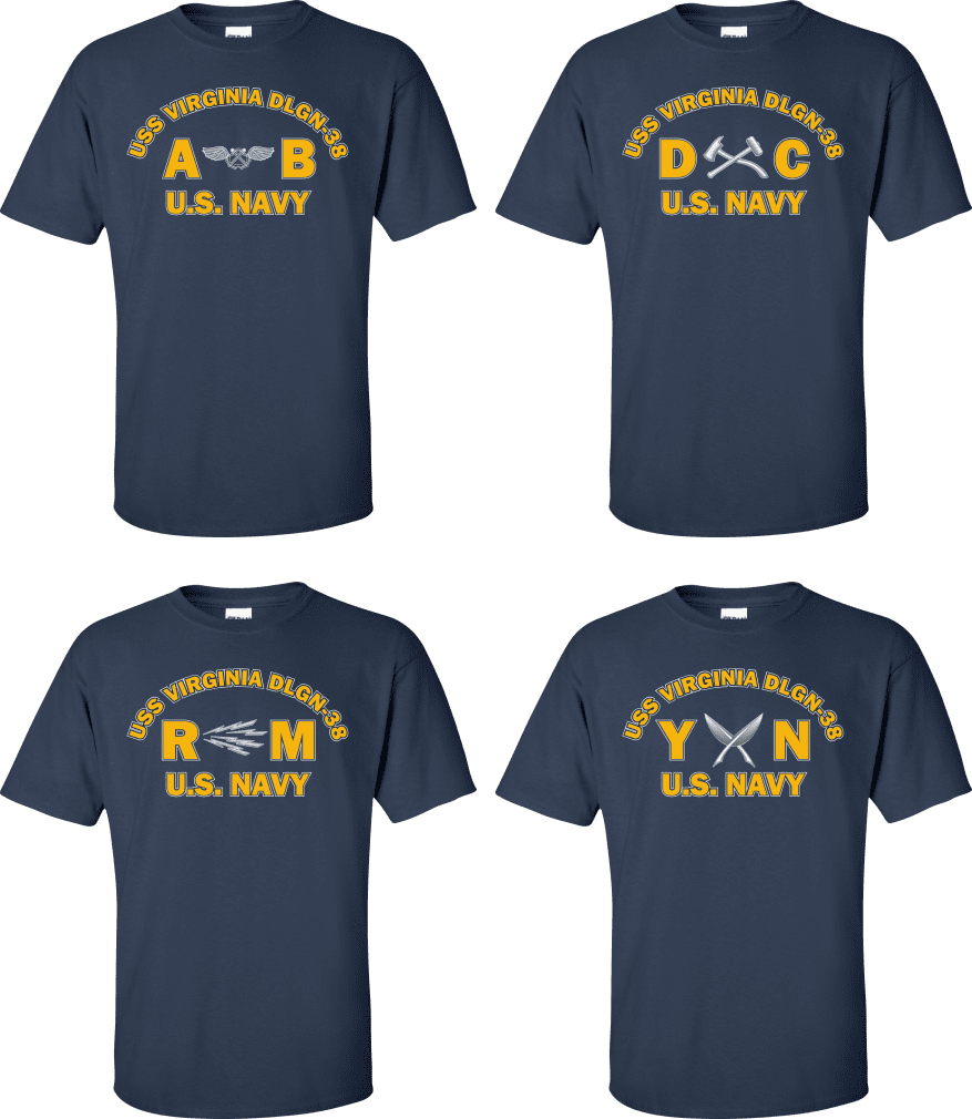 Due to disruptions in supply chains, this design will be embroidered on a Champion, Gildan, Jerzees or comparable brand.Proudly display your ship and rate with our top quality USS VIRGINIA DLGN-38 Rates t-shirts, sweatshirts, and hoodies. These fine U.S. Navy apparel items will make you the envy of your veteran buddies, or will make a fine gift! Our USS VIRGINIA DLGN-38 shirts are proudly printed in the USA!