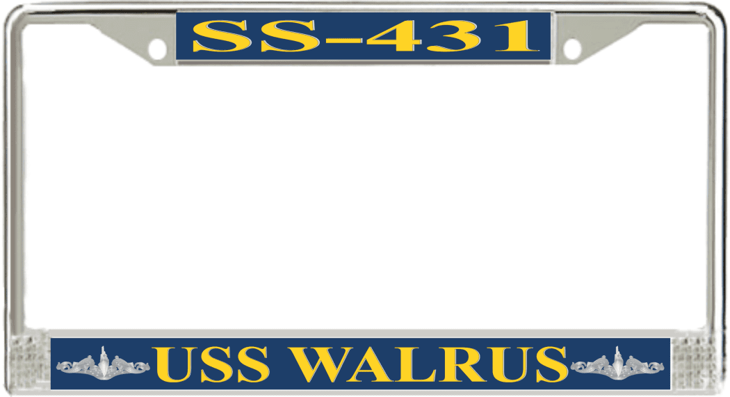 USS Walrus SS-431 License Plate Frame This USS Walrus SS-431 License Plate Frame is proudly made in the USA at our facilities in Scottsboro, Alabama. Each Frame features top and bottom sublimated design strips that are poly coated for a protective gloss finish. Please check your state and local regulations for compatibility of these frames for use on your vehicle.