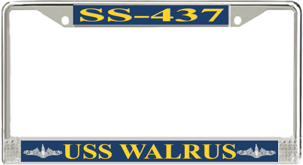 USS Walrus SS-437 License Plate Frame This USS Walrus SS-437 License Plate Frame is proudly made in the USA at our facilities in Scottsboro, Alabama. Each Frame features top and bottom sublimated design strips that are poly coated for a protective gloss finish. Please check your state and local regulations for compatibility of these frames for use on your vehicle.