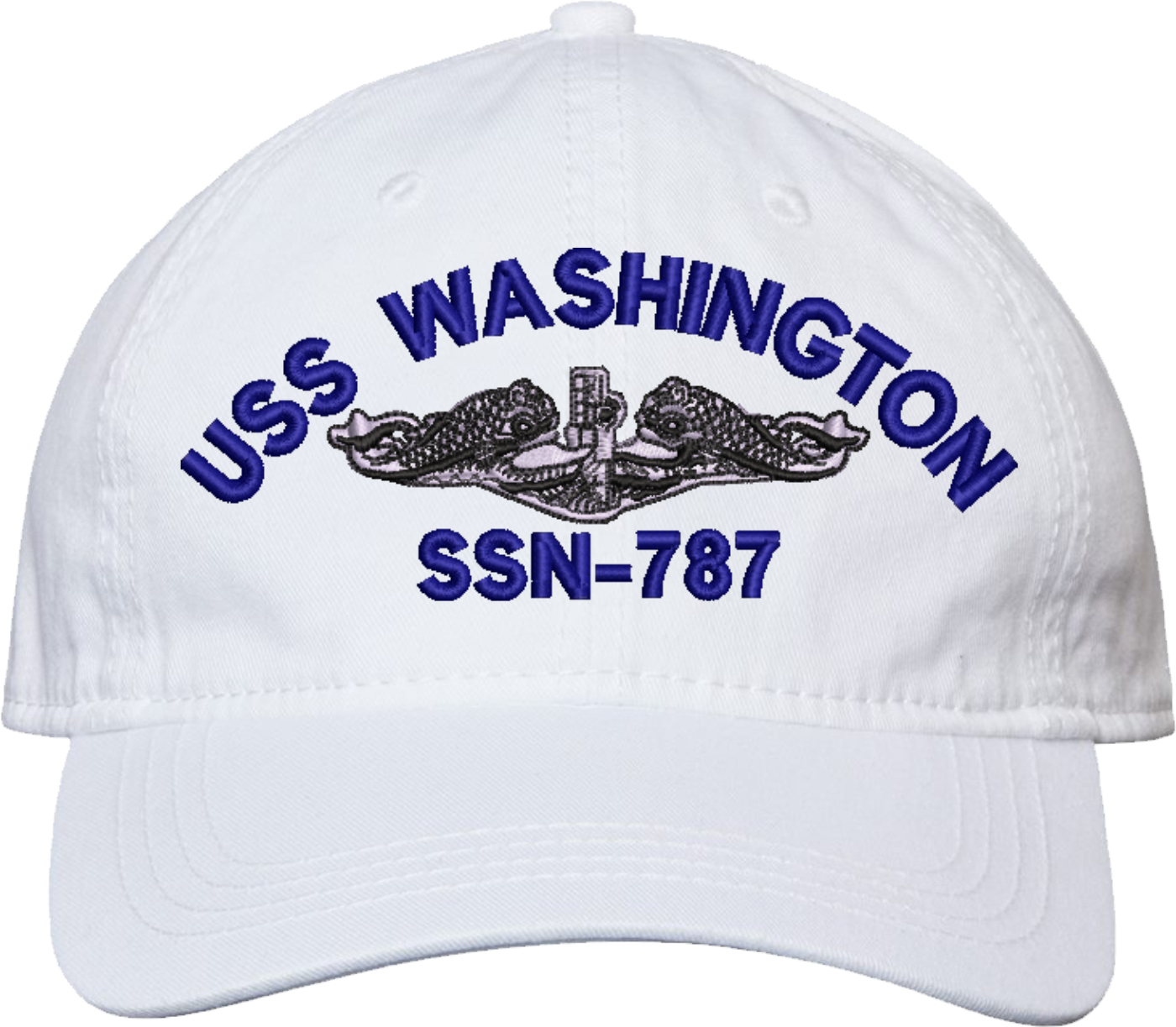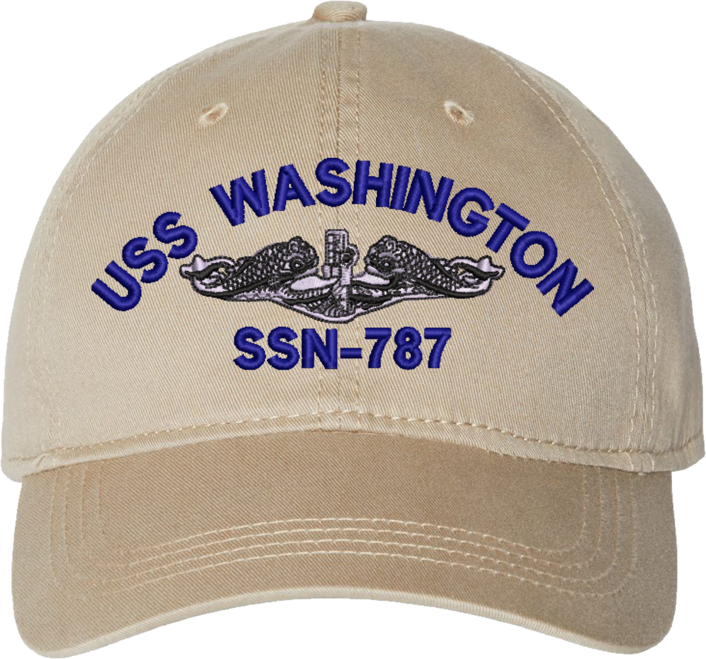 Show your Navy pride with this USS Washington SSN-787 with Dolphins Unstructured Dad Cap from MilitaryBest. Crafted from 100% washed chino twill cotton, this six-panel, low-profile cap offers a relaxed and comfortable fit. Featuring high-quality embroidery done in our Scottsboro, Alabama facility, this cap is designed with a pre-curved visor and an adjustable tri-glide buckle closure for a perfect fit. Whether for everyday wear or as a meaningful gift, this cap is a great way to honor your own or a loved one's service.For caps ordered with custom embroidered personalized text please allow an additional 3 to 5 days production time. All custom back text will be embroidered in ALL CAPITAL LETTERS. Caps with back text or eggs are non-returnable unless there is a material defect in the cap.