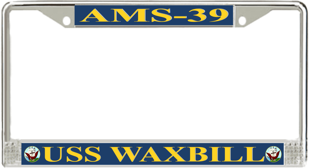 USS Waxbill AMS-39 License Plate Frame This USS Waxbill AMS-39 License Plate Frame is proudly made in the USA at our facilities in Scottsboro, Alabama. Each Frame features top and bottom sublimated design strips that are poly coated for a protective gloss finish. Please check your state and local regulations for compatibility of these frames for use on your vehicle.