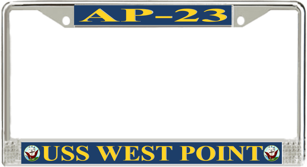 USS West Point AP-23 License Plate FrameThis USS West Point AP-23 License Plate Frame is proudly made in the USA at our facilities in Scottsboro, Alabama. Each of our MilitaryBest U.S. Navy Frames feature top and bottom Poly Coated Aluminum strips that are printed using sublimation which gives these quality automobile military frames a beautiful high gloss finish.