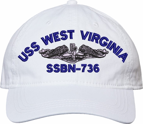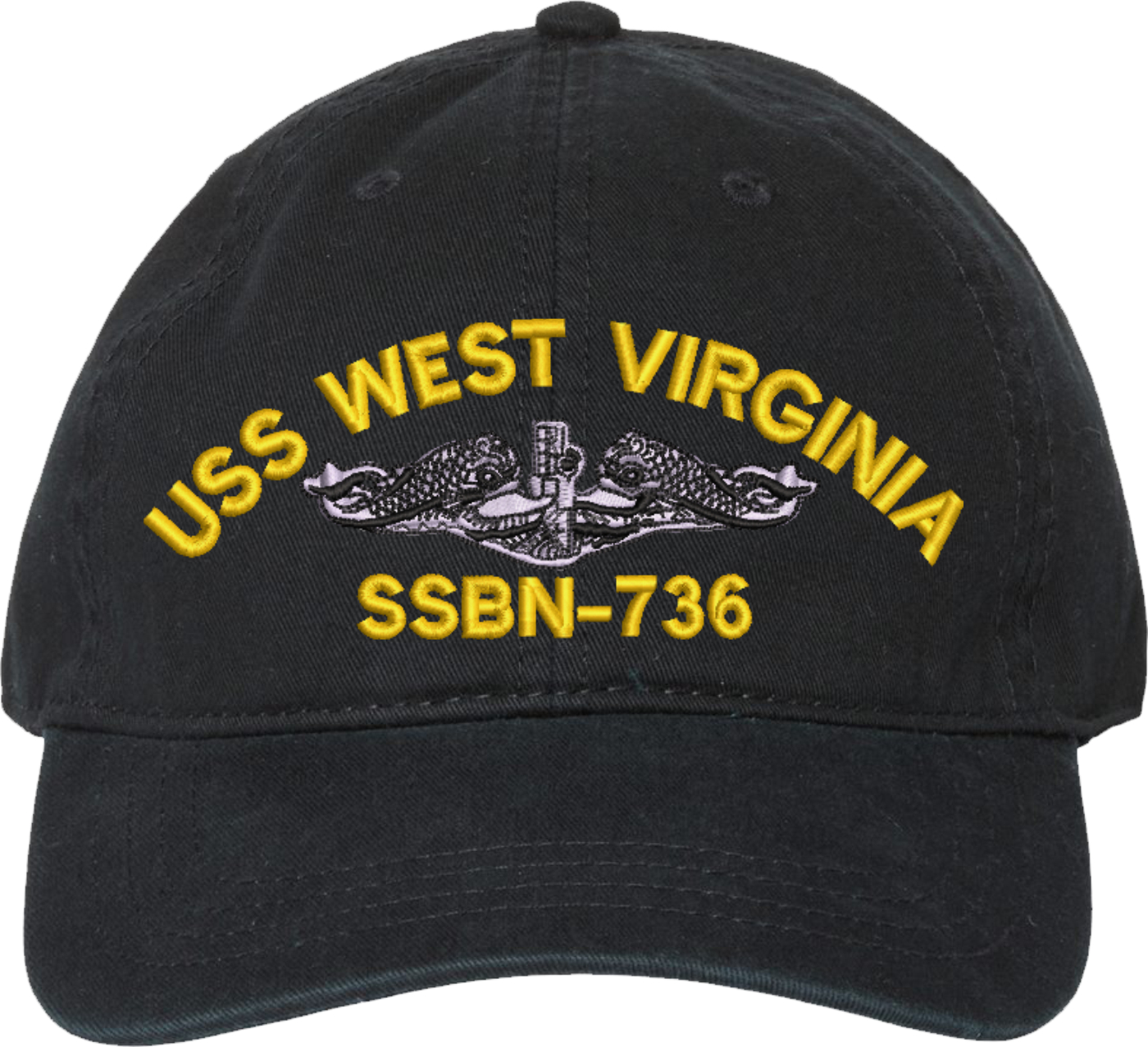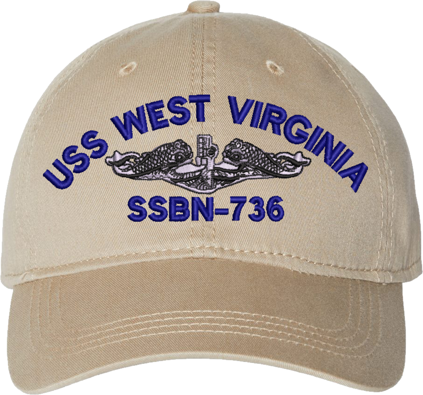Show your Navy pride with this USS West Virginia SSBN-736 with Dolphins Unstructured Dad Cap from MilitaryBest. Crafted from 100% washed chino twill cotton, this six-panel, low-profile cap offers a relaxed and comfortable fit. Featuring high-quality embroidery done in our Scottsboro, Alabama facility, this cap is designed with a pre-curved visor and an adjustable tri-glide buckle closure for a perfect fit. Whether for everyday wear or as a meaningful gift, this cap is a great way to honor your own or a loved one's service.For caps ordered with custom embroidered personalized text please allow an additional 3 to 5 days production time. All custom back text will be embroidered in ALL CAPITAL LETTERS. Caps with back text or eggs are non-returnable unless there is a material defect in the cap.